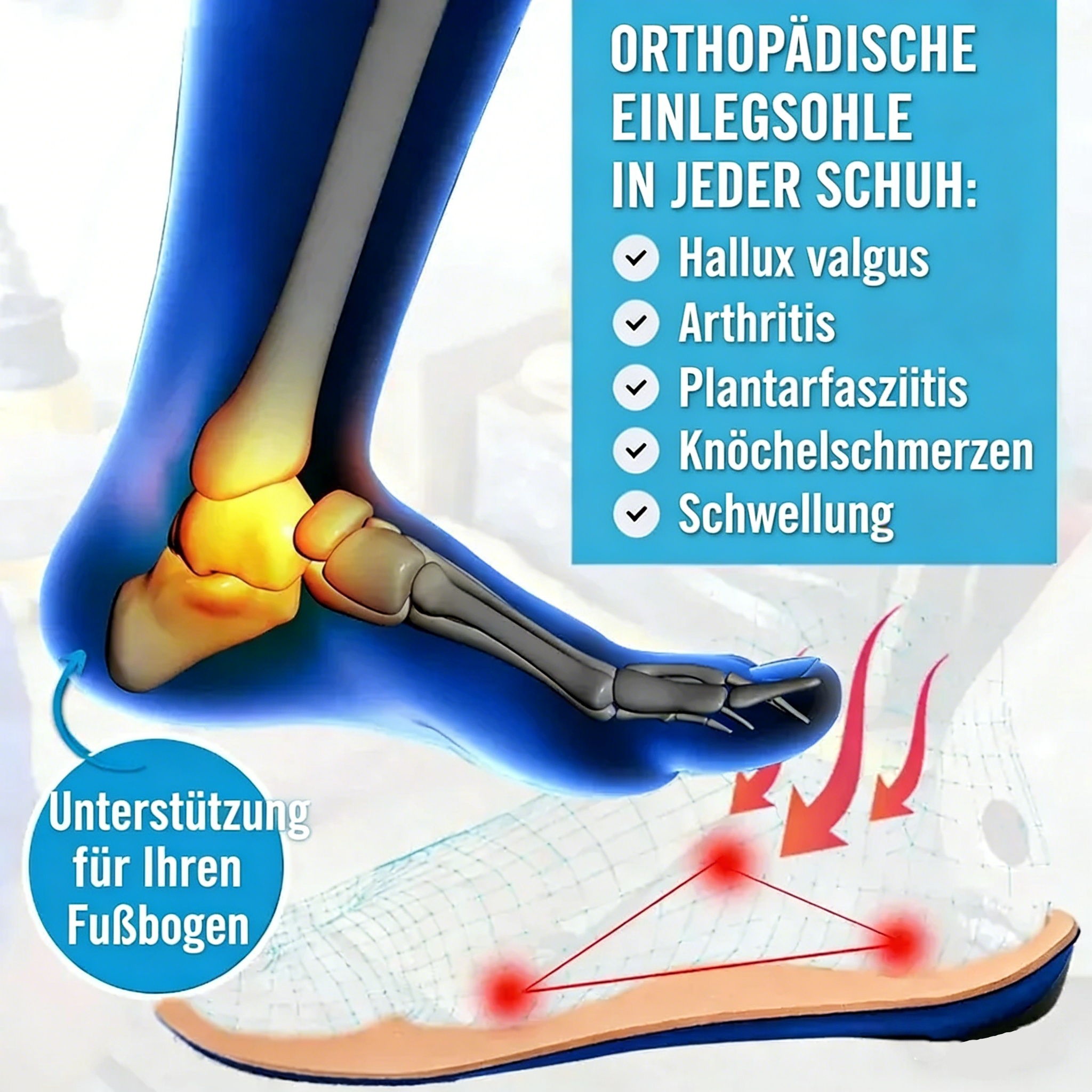 Plantarfasziitis? Fußschmerzen? Knieschmerzen? Plattfüße? Orthopädische Schuhe bieten die ultimative Lösung. Hochwertige ORTHOPÄDISCHE EINLAGEN mit verstellbarem Fußgewölbestützer und mehreren Polsterschichten bieten weiche, kissenartige Unterstützung, die Wunder wirkt, um den Komfort zu verbessern und die Schmerzen an Fuß und Ferse bis hinauf zu KNIE, HÜFTEN und UNTEREM RÜCKEN zu lindern.
